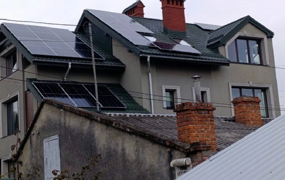 Встановлення гібридної сонячної електростанції у м. Львів. Ми використовували сонячні панелі від компанії LONGi LR5-72HTH-585M. Для кріплення панелей використано алюмінієві конструкції, а дах покрито металочерепицею. Основу системи складає гібридний інвертор Deye SUN-10K-SG04LP3-EU який забезпечує стабільну роботу СЕС та дозволяє налаштовувати її для різних режимів. Електроенергія зберігається у чотирьох акумуляторних батареях Pro-B LiFePO4 ,що разом забезпечують загальну ємність 10,24 кВт. При середньому споживанні електроенергії в 1 кВт/год ємності цих акумуляторів вистачить на 10 годин автономної роботи. Мета даної СЕС - економія на електроенергії та безперебійне забезпечення електроенергії в умовах відключення світла. В середньому СЕС генеруватиме 10 100 кВт за рік, що повністю покриває всі потреби будинку та допоможе зекономити близько 43 700 грн щорічно. Середній термін служби такої станції - 25 років.