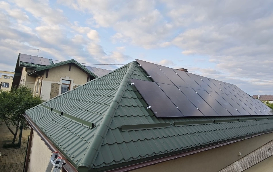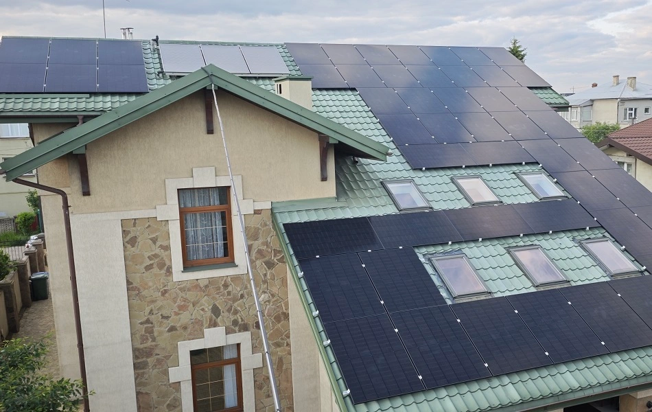 Це СЕС на даху приватного будинку загальною потужністю 27,3 кВт. Гібридний інвертор Deye SUN-30K-SG01HP3 забезпечує стабільну роботу всієї системи та дозволяє налаштувати різні режими роботи СЕС. Електроенергія зберігається у чотирьох акумуляторних батареях BOS-G LiFePO4 ,що разом забезпечують загальну ємність 20,48 кВт. При середньому споживанні електроенергії в 1 кВт/год ємності цих акумуляторів вистачить на 20 годин автономної роботи. Мета цієї станції — економія на електроенергії з можливістю продажу надлишкової енергії в мережу за зеленим тарифом.Станція здатна генерувати близько 31 400 кВт електроенергії на рік, що дозволяє економити до 135 640 грн щорічно. Це повністю покриває річне споживання енергії будинку. Середній термін служби такої станції — 25 років.