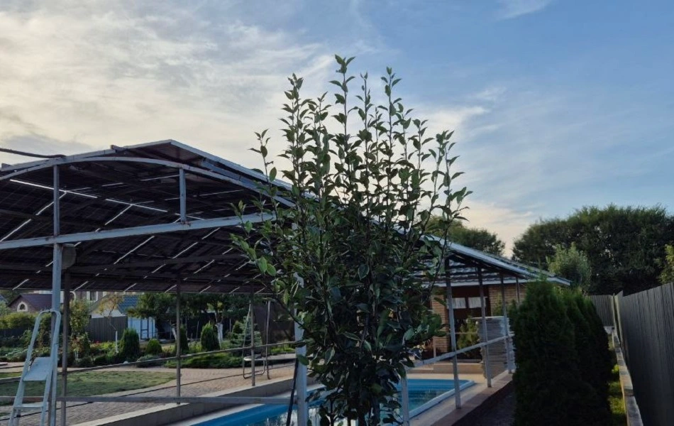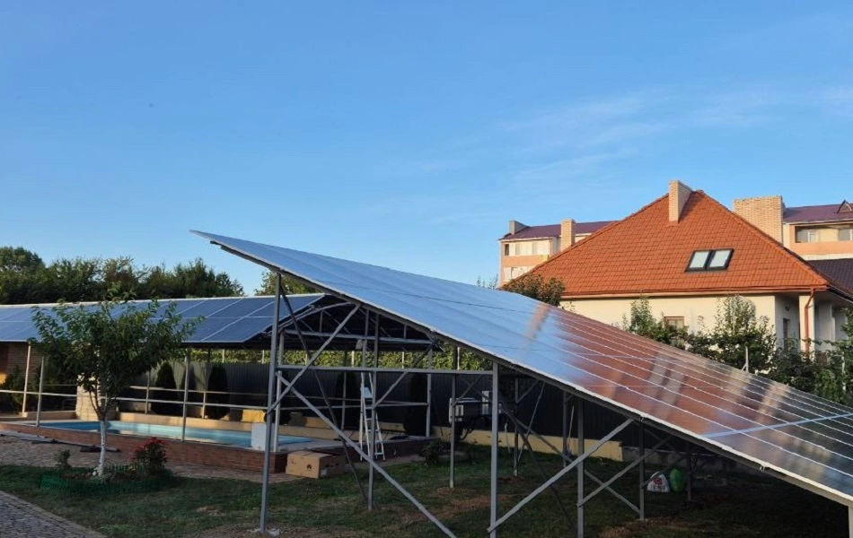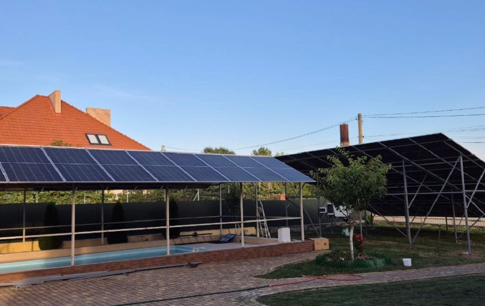 Це нестандартна СЕС яка поєднює в собі назему конструкцію та навіс над басейном загальною потужністю 40 кВт. Ми використовували сонячні панелі від компанії Longi Solar LR8-66HGD-615M Bifacial, а конструкція зварена з чорного металу. Мережевий інвертор Huawei SUN2000-30KTL-M3 забезпечує стабільну роботу всієї системи та дозволяє налаштувати різні режими роботи СЕС. Мета цієї станції — економія на електроенергії з можливістю продажу надлишкової енергії в мережу за зеленим тарифом.Станція здатна генерувати близько 46 020 кВт електроенергії на рік, що дозволяє економити до 198 770 грн щорічно. Це повністю покриває річне споживання енергії будинку. Середній термін служби такої станції — 25 років.