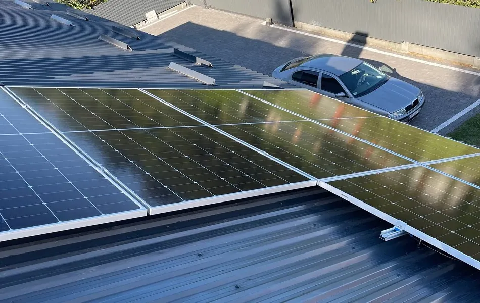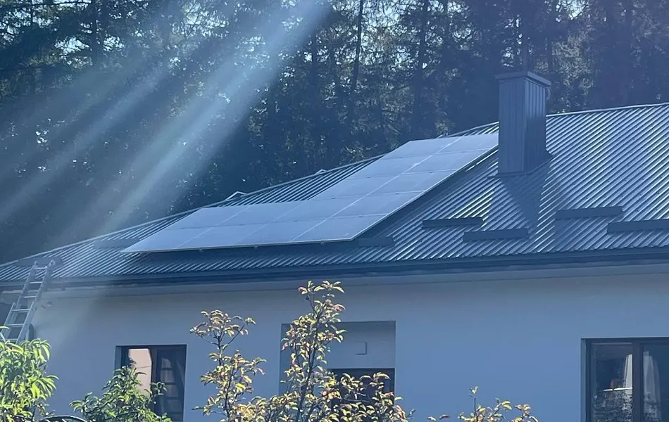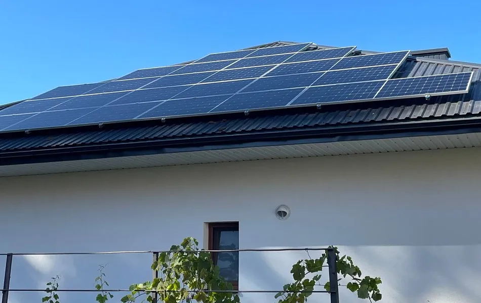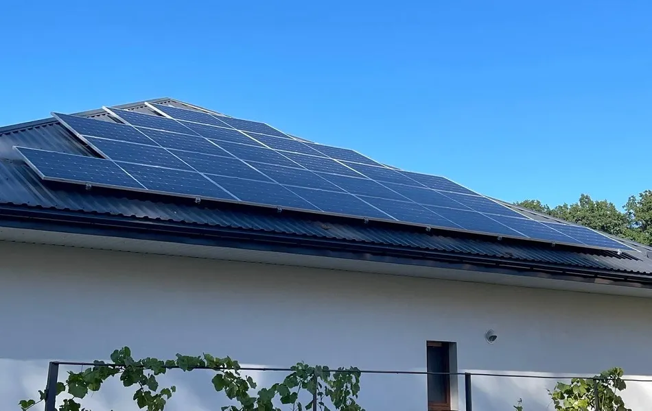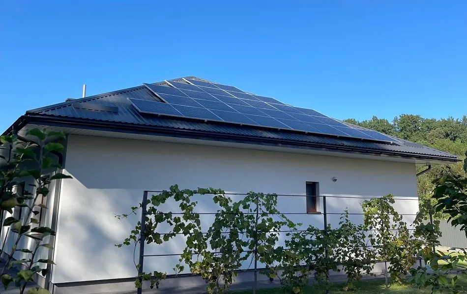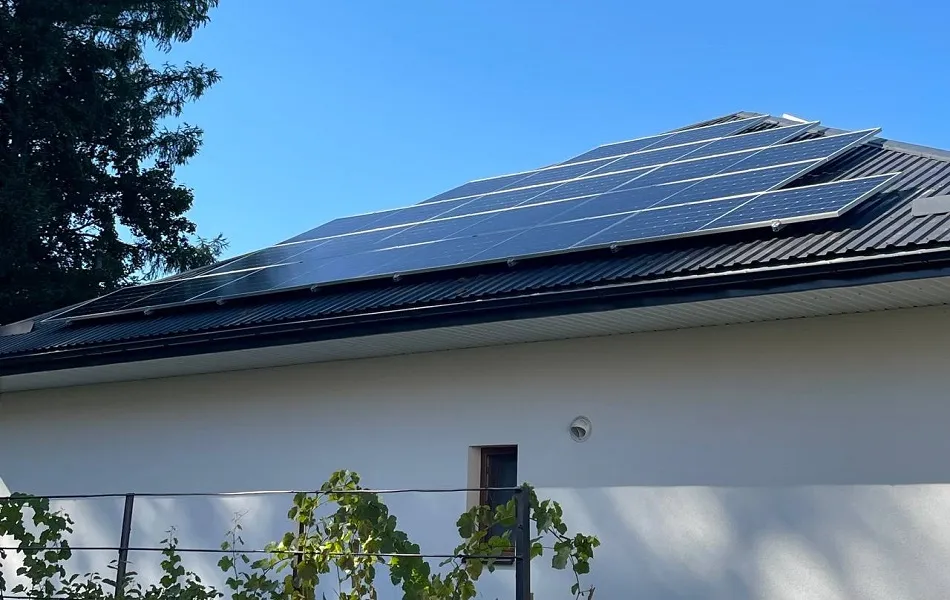 Встановлення гібридної сонячної електростанції в м. Брюховичі, Львівська область. Ми використовували сонячні панелі від компанії LONGi LR5-72HTH-585M. Для кріплення панелей використано алюмінієві конструкції, а дах покрито металочерепицею. Основу системи складає гібридний інвертор SUN-20K-SG01HP3-EU-AM2 який забезпечує стабільну роботу СЕС та дозволяє налаштовувати її для різних режимів. Електроенергія зберігається у чотирьох акумуляторних батареях BOS-GM5. ,що разом забезпечують загальну ємність 20,48 кВт. При середньому споживанні електроенергії в 1 кВт/год ємності цих акумуляторів вистачить приблизно на 20 годин автономної роботи. Мета даної СЕС - економія на електроенергії та безперебійне забезпечення електроенергії в умовах відключення світла. В середньому СЕС генеруватиме 13 500 кВт за рік, що повністю покриває всі потреби будинку та допоможе зекономити близько 58 200 грн щорічно. Середній термін служби такої станції - 25 років.