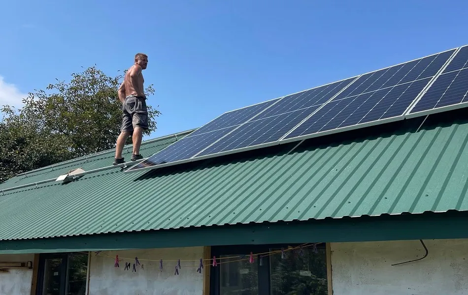 Встановлення гібридної сонячної електростанції в с. Солонка, Львівська область. Ми використовували сонячні панелі від компанії LONGi LR5-72HTH-585M. Кріплення під панелі використане з алюмінію. Покриття даху - бітомна черепиця. Гібридний інвертор SUN-6K-SG05LP1-EU забезпечує якісну роботу всієї системи та дозволяє налаштувати роботу СЕС в різних режимах. АКБ Deye SE-G5.1 Pro-B забезпечує безперебійне електрозабезпечення будинку, загальна ємність АКБ 5,1 кВт, що при середньому споживанні в 1 кВт/год ємності АКБ вистачить на 4-5 год. Мета даної СЕС - економія на електроенергії та безперебійне забезпечення електроенергії в умовах відключення світла. В середньому СЕС генеруватиме 6 060 кВт за рік та зможе економити близько 26 180 грн щорічно, що майже повністю перекриває споживання даного будинку. Середній термін служби такої станції - 25 років.