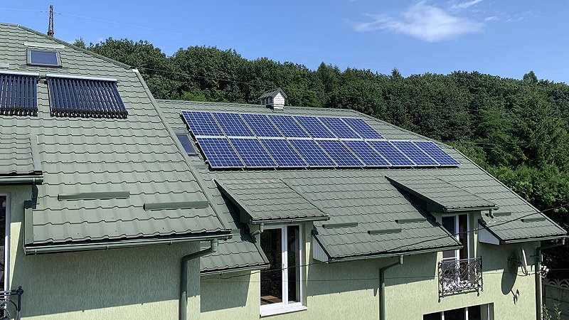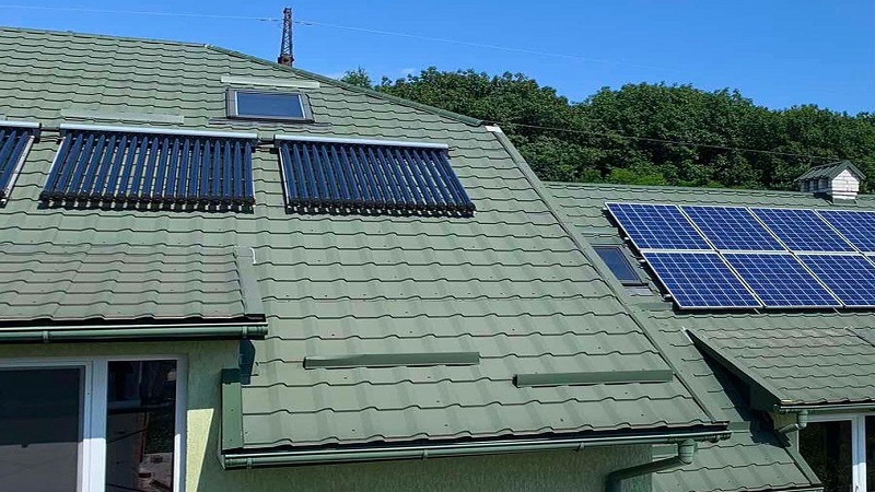 Встановлення мережевої сонячної електростанції в с. Оброшине, Львівської області. Використані сонячні панелі Axioma Energy AXM144-9-166-450, замонтовані на даховій конструкції з анодованого алюмінію. Покриття даху - металочерепиця. Мережевий інвертор Huawei SUN2000-5KTL-M1 забезпечує якісну роботу всієї системи та дозволяє як користуватись будинку згенерованою електроенергією, так і "скидати" надлишки в мережу.
