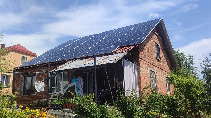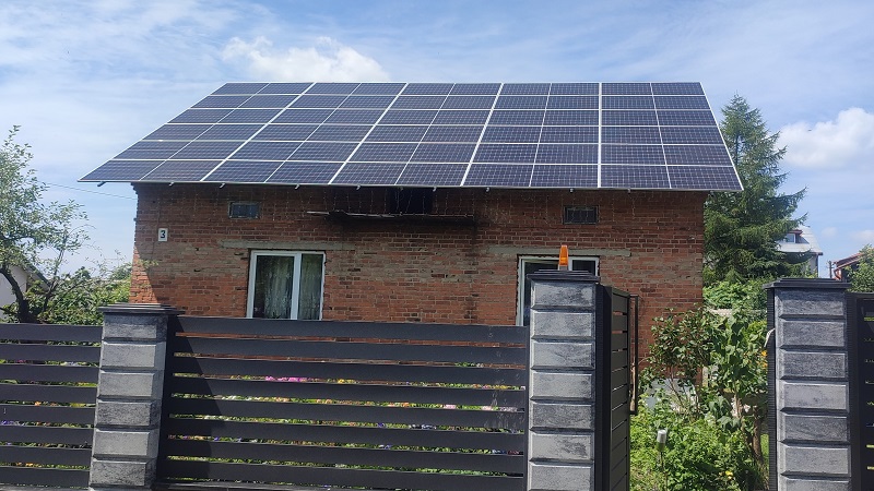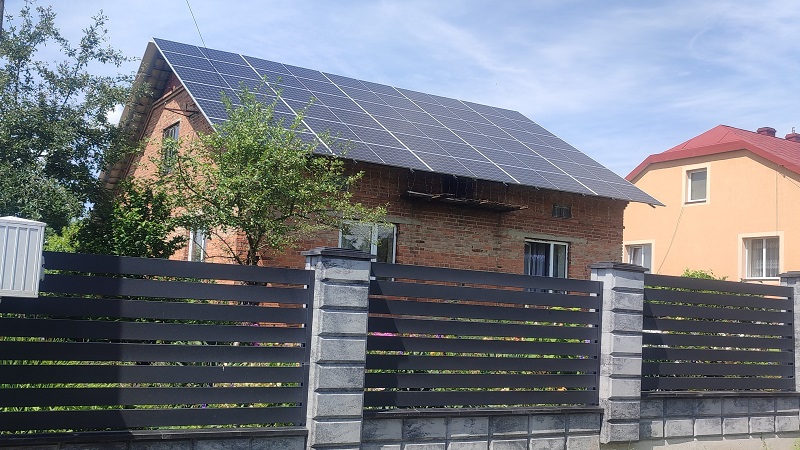 Встановлення мережевої сонячної електростанції в с. Оброшине, Львівської області. Використані сонячні панелі LONGi LR5-72HPH-545M, замонтовані на даховій конструкції з анодованого алюмінію. Покриття даху - шифер. Мережевий інвертор Huawei SUN2000-30KTL-M0 забезпечує якісну роботу всієї системи та дозволяє як користуватись будинку згенерованою електроенергією, так і "скидати" надлишки в мережу.
