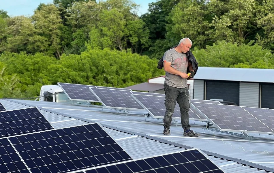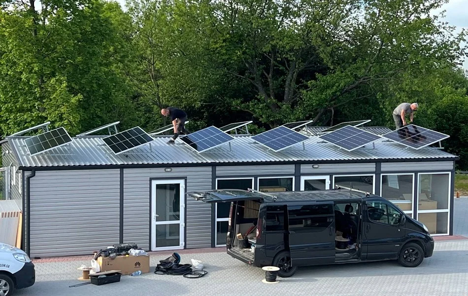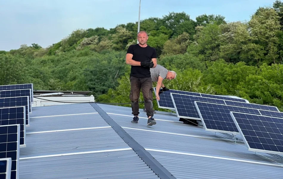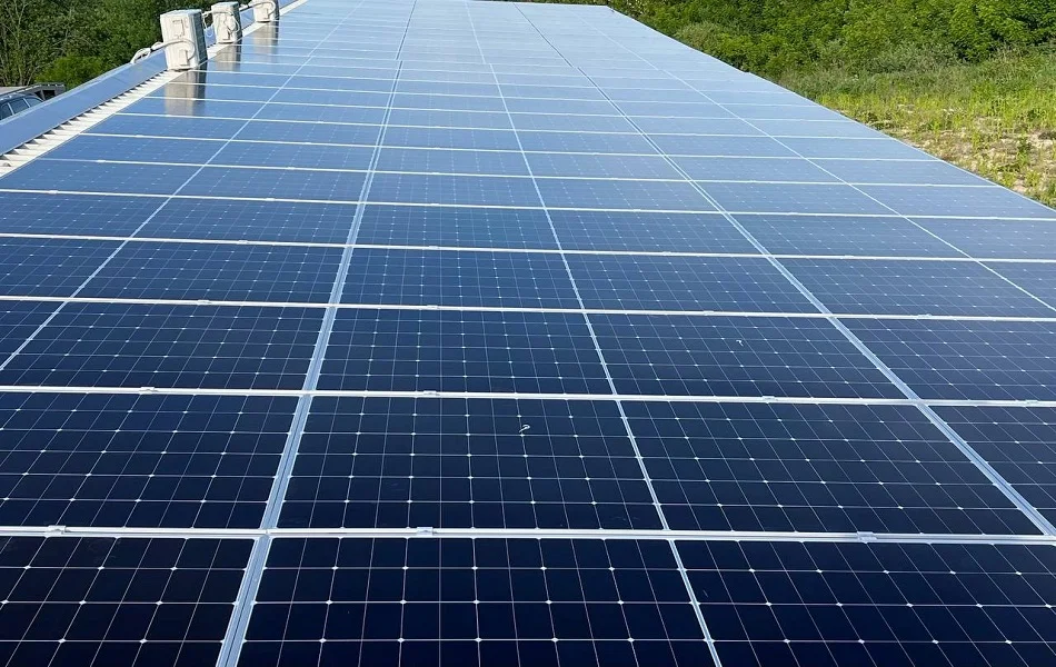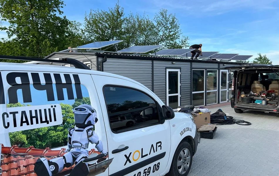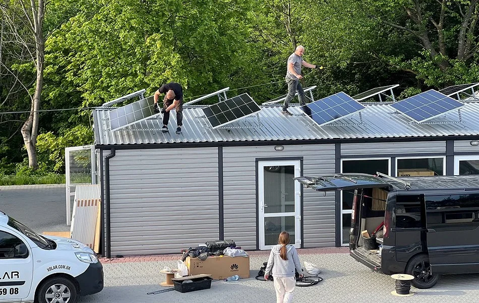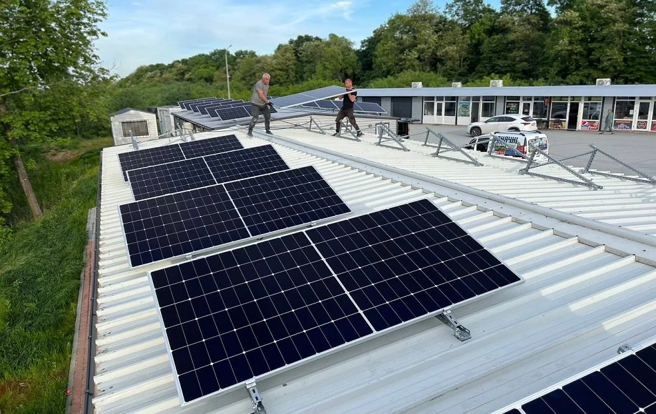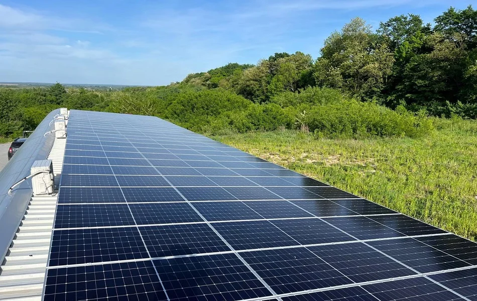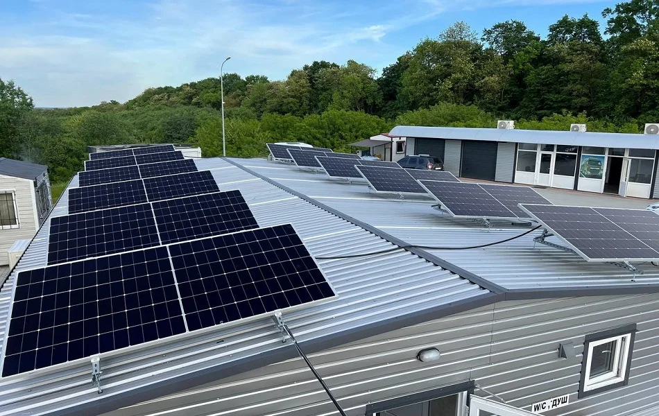 Встановлення мережевої сонячної електростанції в с. Шегині, Львівська область на власне споживання. Ми використовували сонячні панелі від компанії LONGi LR5-72HTH-585M. Кріплення під панелі використане з анодованого алюмінію. Частина панелей розташована на блочній системі кріплення, інша частина на сусідніх будівлях на системі антикут. Покриття даху - металопрофіль. Мережевий інвертор Huawei SUN2000-100KTL-M2 забезпечує якісну роботу всієї системи. Мета даної СЕС - економія на електроенергії. В середньому СЕС генеруватиме 70 030 кВт за рік економитиме близько 560 000 грн на рік, що практично повністю перекриває споживання даного об’єкту. Середній термін служби такої станції - 25 років.