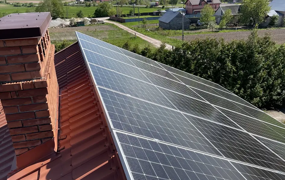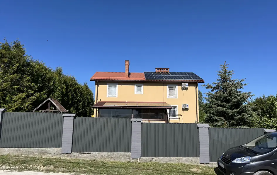 Встановлення гібридної сонячної електростанції в с. Ясниська, Львівська область. Використані сонячні панелі LONGi LR5-72HTH-585M. Кріплення під панелі використане з анодованого алюмінію, стандартий профіль, оскільки дах скатний. Покриття даху - металочерепиця. Гібридний інвертор Deye SUN-12K-SG02LP1-EU-AM3 забезпечує якісну роботу всієї системи та дозволяє налаштувати роботу СЕС в різних режимах. АКБ Pylontech US5000 4.8 забезпечує безперебійне електрозабезпечення будинку, загальна ємність АКБ 4,8 кВт, що при середньому споживанні в 0,5 кВт/год ємності АКБ вистачить на 9-10 год. Мета даної СЕС - економія на електроенергії та безперебійне забезпечення електроенергії в умовах відключення світла. В середньому СЕС генеруватиме 12 120 кВт за рік, що майже повністю перекриває споживання даного будинку. Середній термін служби такої станції - 25 років.